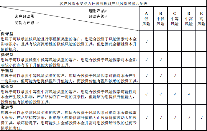 以蒙银理财为例,将理财产品按风险程度分为5个等级,从低到高分别为:低风险、中低风险、中等风险、中高风险、高风险;并根据投资者的资产、负债、收入来源、投资经验和风险偏好等不同情况,将投资者的风险承受能力等级分为五级,分别为:保守型、稳健型、平衡型、成长型、激进型。