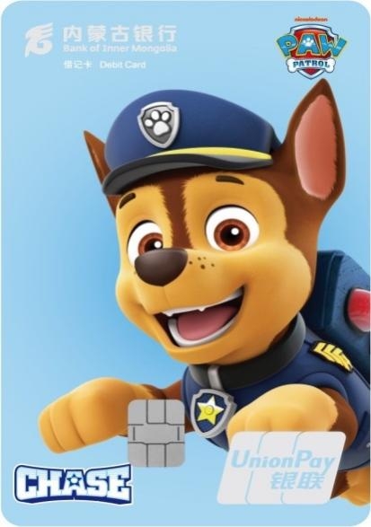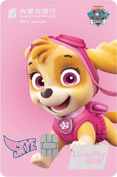 “汪汪队立大功”是美国学龄前儿童教育动画片,讲述由狗狗组成的超级英雄巡逻队,在各种困境中英勇无畏拯救居民的故事。汪汪队主题儿童借记卡的设计理念源自于动画片中的主角卡通IP形象,客户可根据喜好选择卡面,分别为活力蓝色的阿奇与少女粉色的天天。卡面形象可爱生动,传递快乐温暖的情绪。同时提供亲子关系绑定服务,支持儿童卡直接绑定到监护人的手机银行,轻松管理儿童卡的资金。
